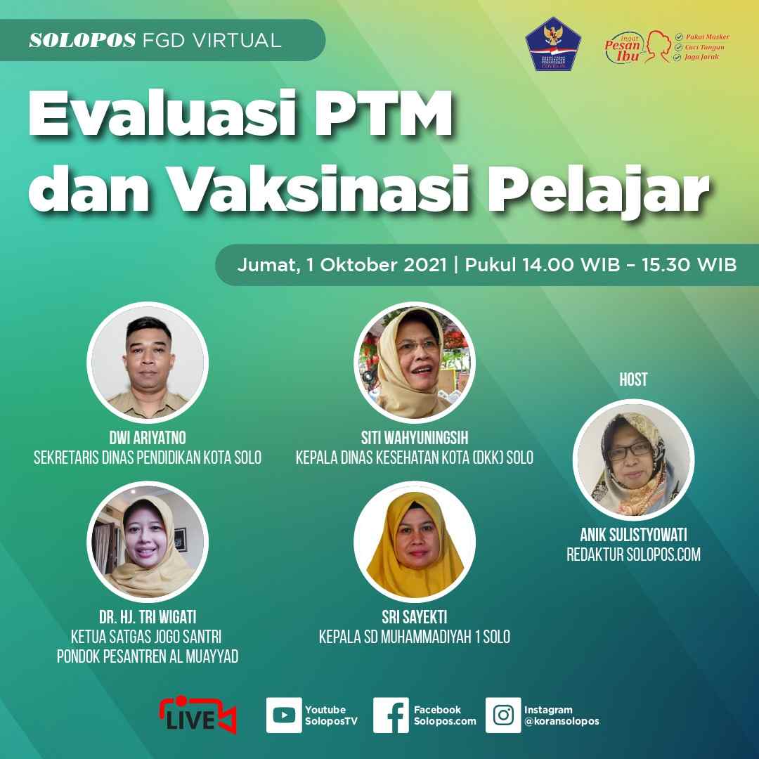 Apakah vaksinasi pelajar dan pembelajaran tatap muka ini sudah berlangsung aman dan normal-normal saja? Simak diskusinya dengan berbagai narasumber dalam Solopos FGD Virtual, Jumat 1 Oktober 2021 pukul 14.00 WIB!