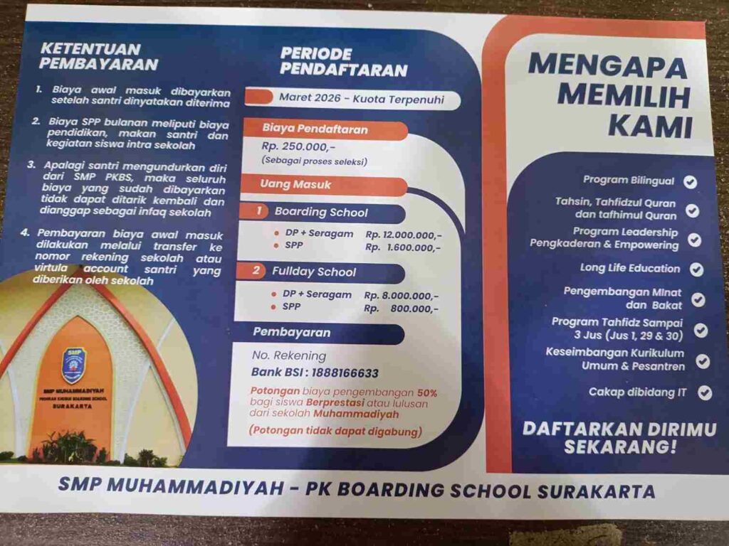 sdmuh1solo.sch.id – SMP Muhammadiyah-PK Boarding School Surakarta resmi membuka Seleksi Penerimaan Murid Baru (SPMB) untuk Tahun Ajaran 2026/2027. Sekolah yang dikenal dengan integritas akademik dan penguatan karakter Islami ini mengundang putra-putri terbaik bangsa untuk bergabung dan mengukir prestasi.