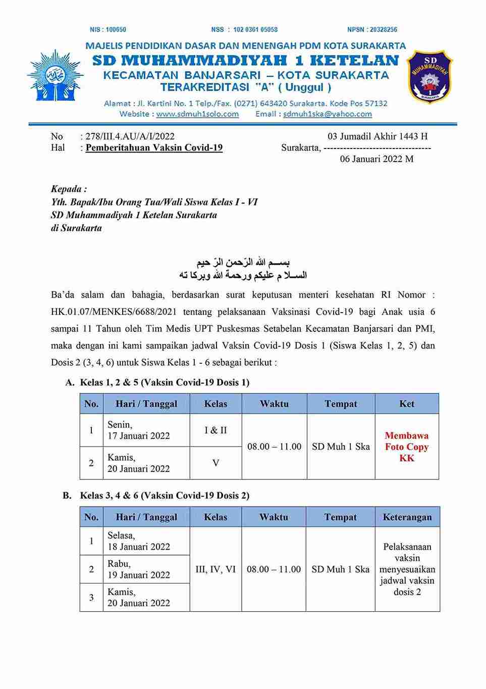 sdmuh1solo.sch.id – Assalamu’alaikum Wr Wb., Selamat pagi bapak ibu wali siswa dan anak-anakku Sekolah Sehat SD Muhammadiyah 1 Ketelan Surakarta.