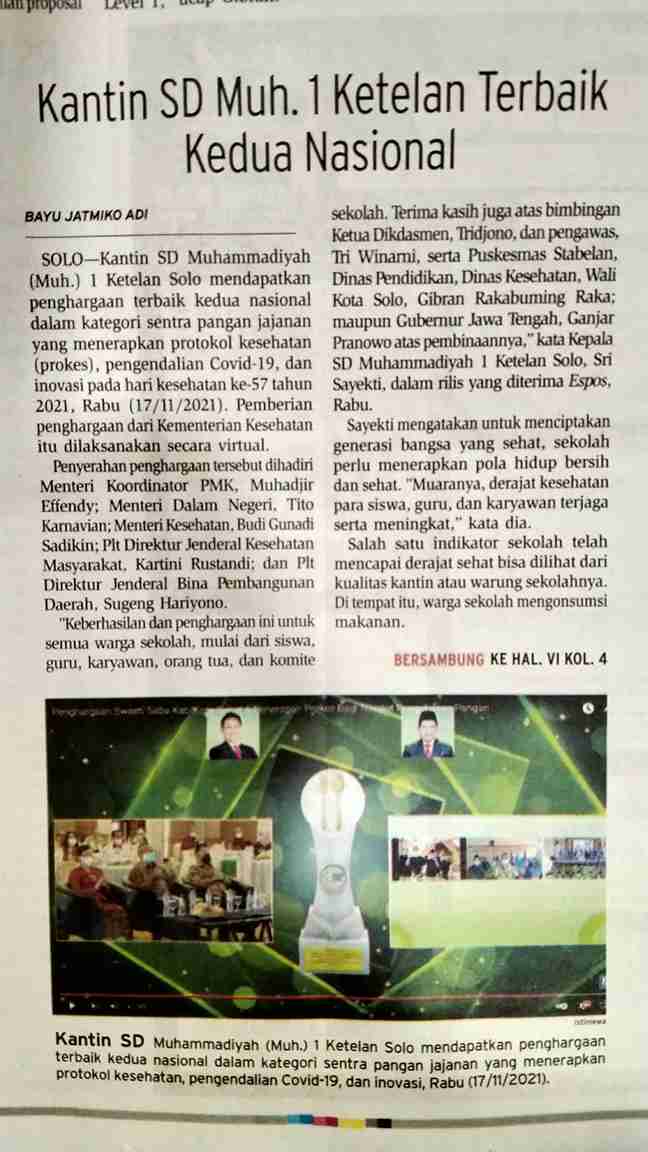 sdmuh1solo.sch.id – Kantin SD Muhammadiyah 1 Ketelan, Solo, mendapatkan penghargaan terbaik kedua nasional untuk kategori sentra pangan jajanan, khususnya dalam menerapkan protokol kesehatan atau prokes dan pengendalian Covid-19 serta inovasi pada Hari Kesehatan Nasional ke-57 tahun 2021, Rabu (17/11/2021).