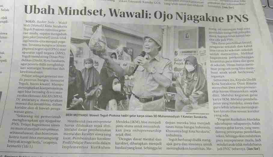 sdmuh1solo.sch.id – “Sekarang ini pemerintah mengharapkan ojo njagakne PNS. Tetapi bagaimana siswa ini muncul menjadi entrepreneur, wirausahawan, dan bisnisman. Justru nanti bisa menampung banyak tenaga kerja,” ucap Wakil Walikota Surakarta Teguh Prakosa, Rabu (18/1/2023).