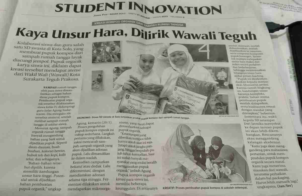 sdmuh1solo.sch.id – Kolaborasi siswa dan guru salah satu SD swasta di Kota Solo, yang membuat pupuk kompos dari sampah rumah tangga layak diacungi jempol. Pupuk organik karya siswa ini, diklaim dapat kreasi tersebut mendapat atensi dari Wakil Wali (Wawali) Kota Surakarta Teguh Prakosa.